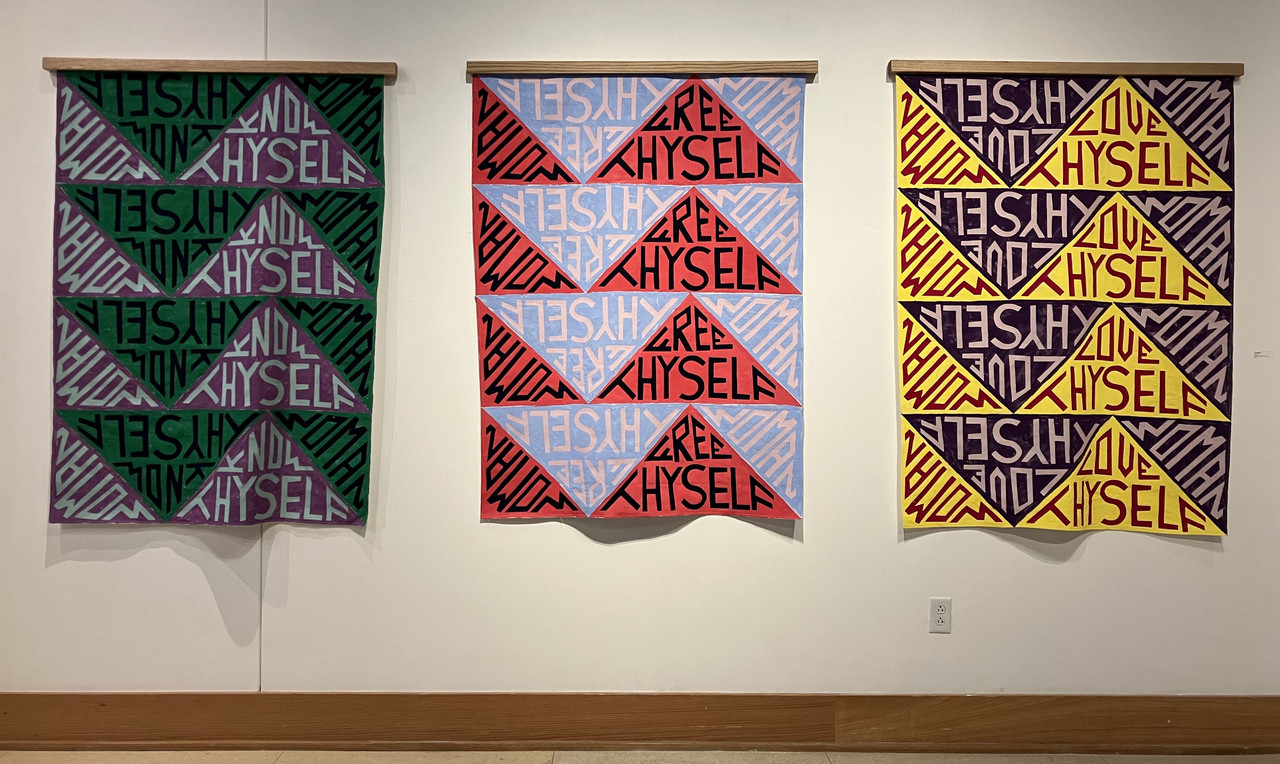 "Banners Triptych," 2025, canvas, fabric, paint, wood. 47 x 63 in. each. Photo courtesy of the artist.
