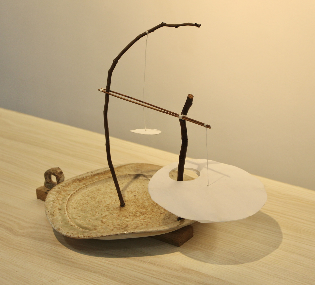 "Displaced Harmony," 2024, wood-fired ceramic, paper, wood, thread, 14 x 8 x 12 in. Photo courtesy of the artist.